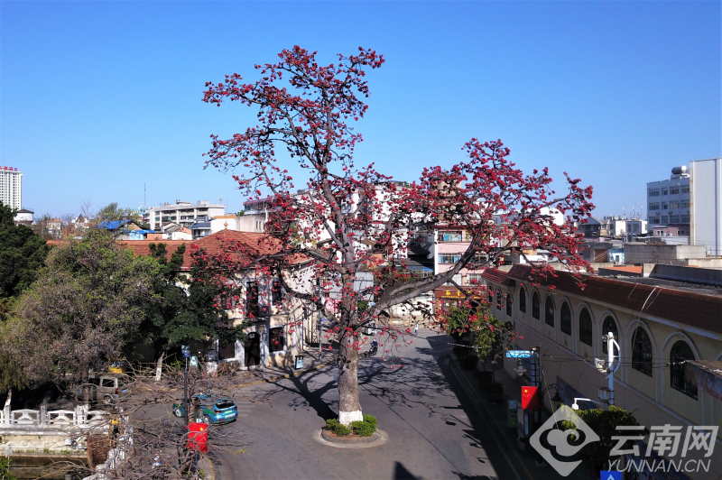 【高清组图】云南蒙自:百年木棉花满树 满树红花春意浓