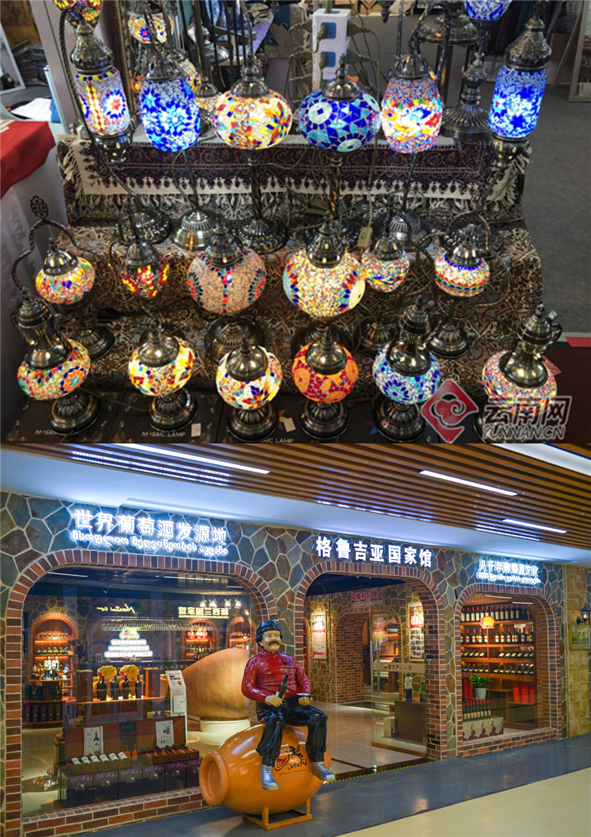 拼版图片上图:南博会上美轮美奂的土耳其水晶灯。记者 杨熙娴 摄;下图:义乌中国进口商品城孵化区,跨境电商企业。记者 张成 摄