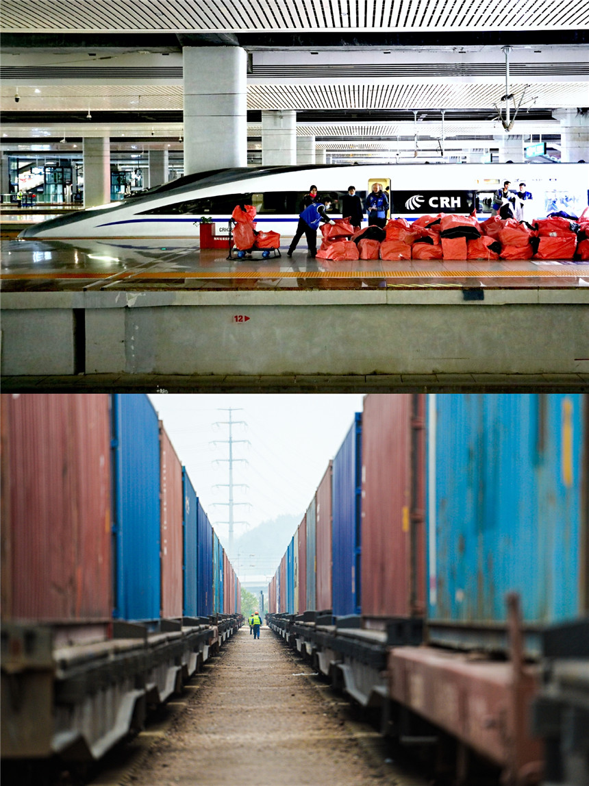 拼版图片上图:云南铁路物流运输;下图:义乌铁路口岸。记者 张成 摄