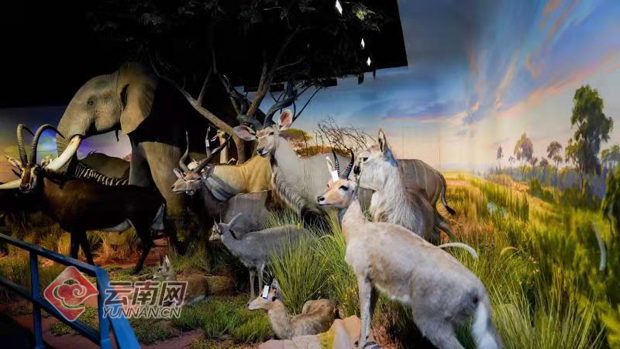 顺着电梯继续再往上走,记者团来到三楼的生物多样性展厅,这里展示了“环球健康与教育基金会”捐赠的来自非洲、美洲的标本,以及草原、雨林、极地、湿地等动物生活场景。鬣狗、北极兔、孔雀……这些与我们人类共生的动物补齐了澄江化石博物馆“生命起源-生命演化-生命多样性”故事的最后一环。
