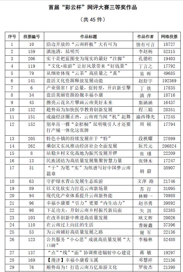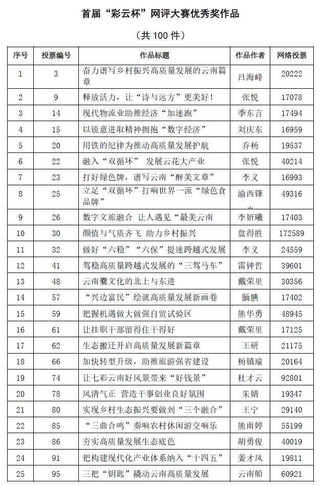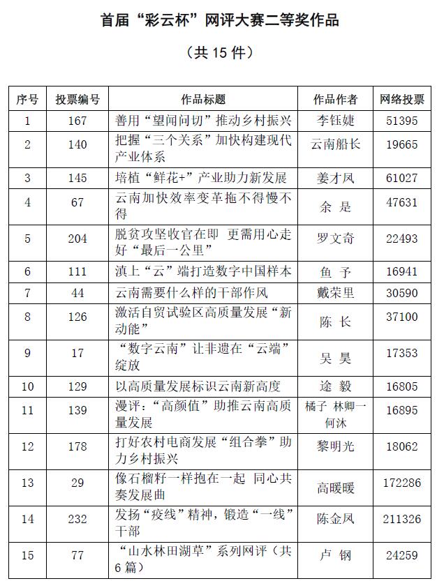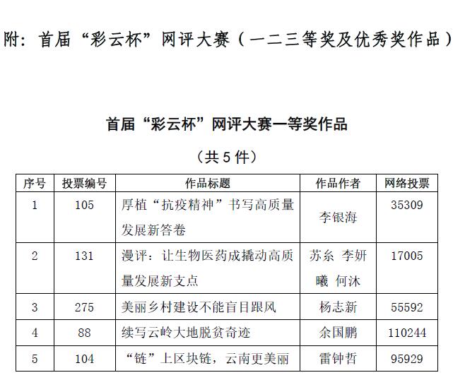 云南网讯(记者 张正 王开妍)12月8日下午,以“聚焦云南高质量跨越式发展”为主题的首届“彩云杯”网评大赛落下帷幕。经大赛终评评委会评定,决出一二三等奖及优秀奖。