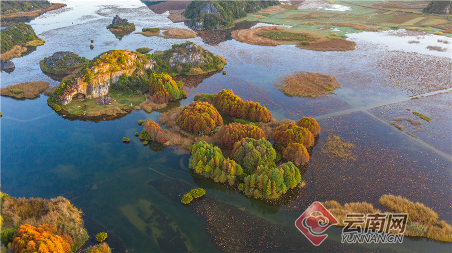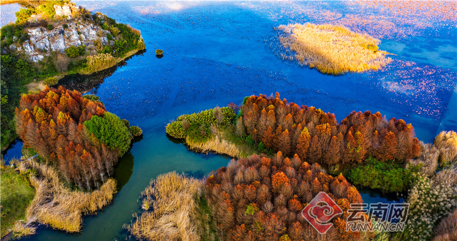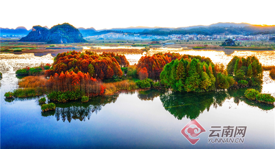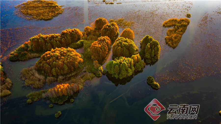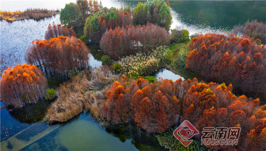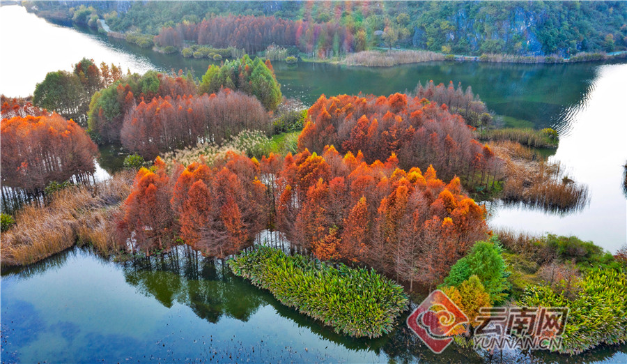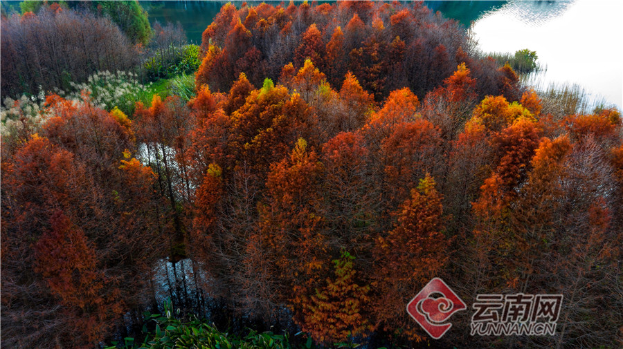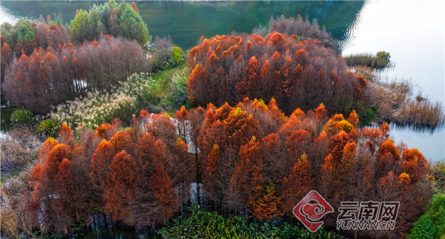 丘北普者黑双甲山,这里的水杉林泛红,婀娜挺立,在阳光照耀下一片红彤彤,美不胜收。落水而生的水杉就像挺拔、俊美的少年,水中盈盈秀美的倒影犹如婆娑起舞的少女,仿佛在相互倾诉衷情。
