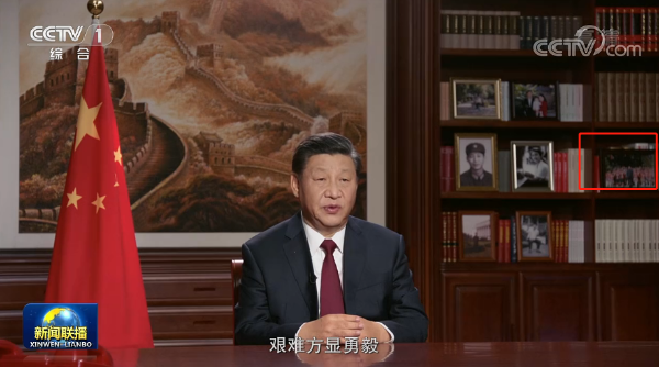12月31日晚7时,国家主席习近平发表2021年新年贺词。场景中,这张和云南有关的照片放在了习近平主席身后的书柜里。