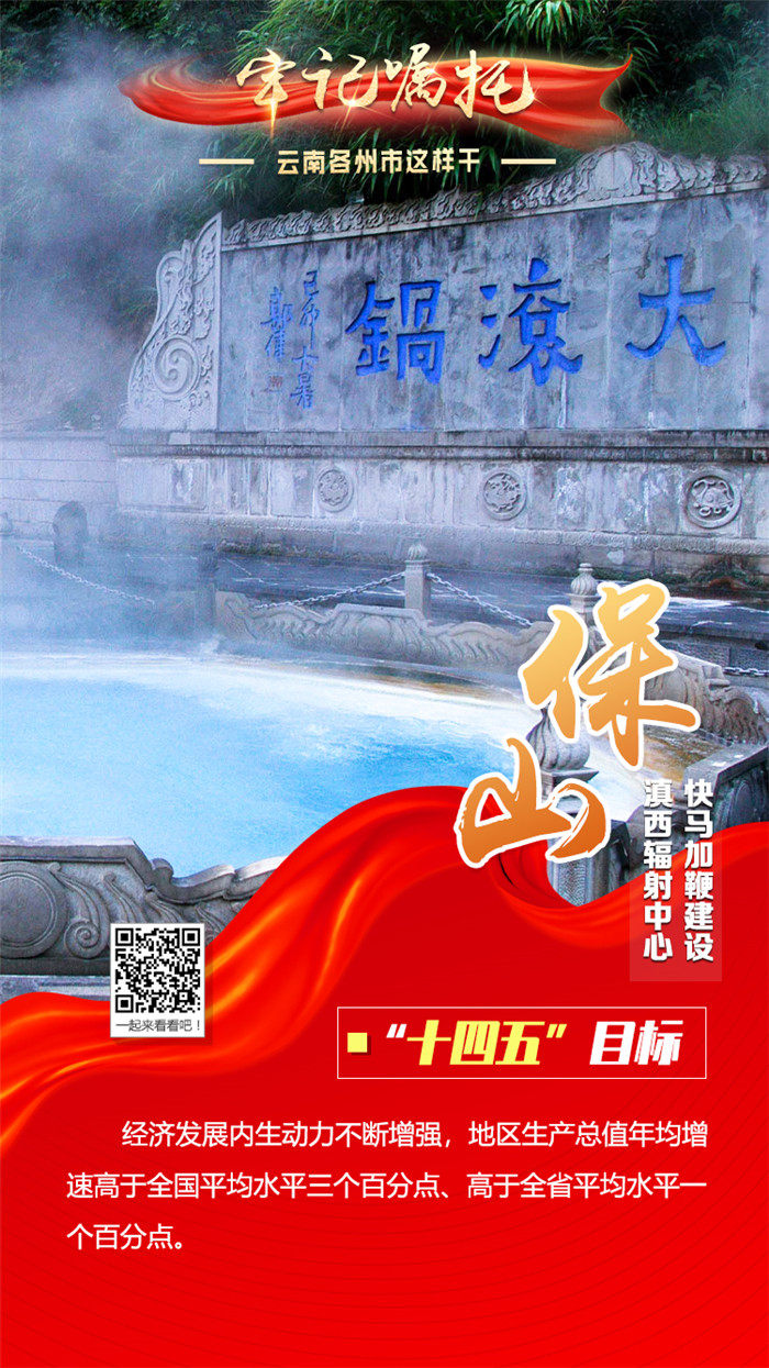 《中共保山市委关于制定保山市国民经济和社会发展第十四个五年规划和二〇三五年远景目标的建议》,对标对表“一个跨越”“三个定位”“五个着力”,明确了建设“滇西辐射中心、滇西工业重镇、滇西高原特色农业示范区、滇西世界健康生活目的地、滇西数字经济发展新高地”的奋斗目标,吹响了奋进“十四五”新征程的嘹亮号角。