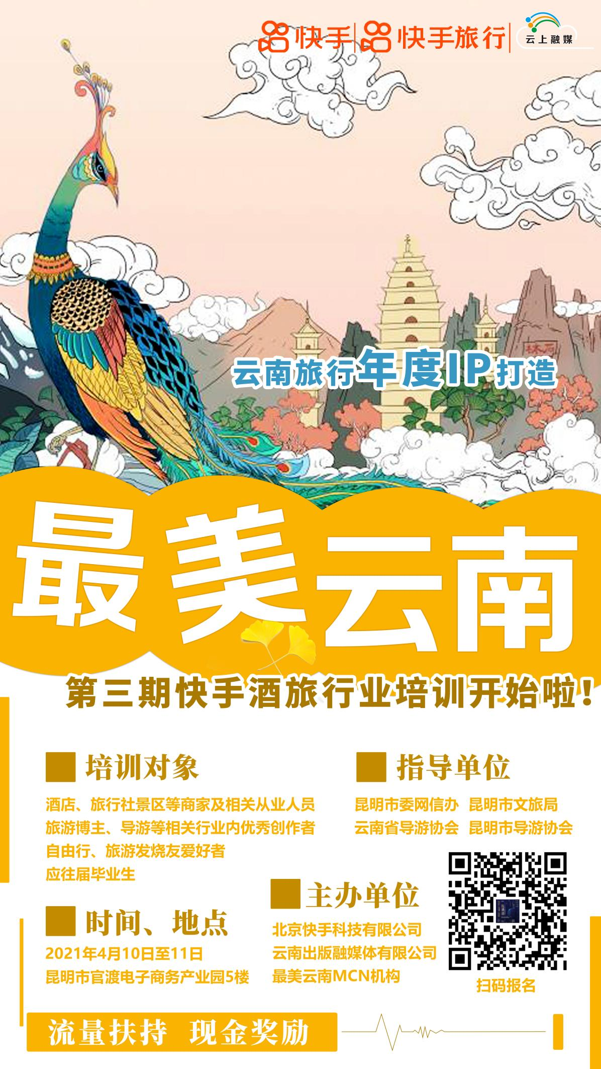 云南网讯(记者 刘畅)4月10日至11日,“最美云南”酒旅第三期培训+短视频大赛将在昆明举行。此次活动由昆明市网信办、昆明市文旅局、云南省导游协会、昆明市导游协会指导,北京快手科技有限公司(快手酒旅)、云南出版融媒体有限责任公司、最美云南快手MCN机构联合主办。