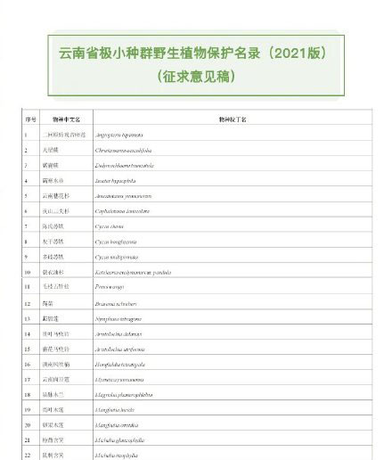 为做好云南省极小种群野生植物拯救保护工作,云南省林草局形成了《云南省极小种群野生植物保护名录(2021版)》(征求意见稿)(下称《名录》),公众可在5月6日前通过相关电话、传真、邮箱等发表意见。