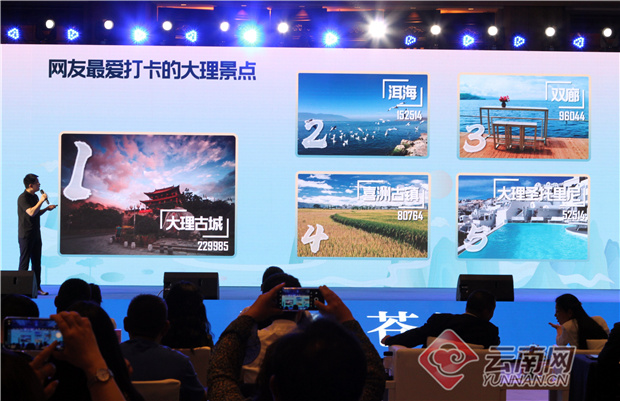 发布会上的“风花雪月 数说大理”城市大数据显示,北京、上海、浙江、重庆、湖北等地的网友对大理最为关注,网友最爱打卡的景点有大理古城、洱海、双廊,最受关注的景点为洱海、苍山。非遗中剑川黑陶排名第一,在大理美食印象中,生皮的关注度最高。和大理相关的音乐《去大理》《蝴蝶泉边》,影视剧《司藤》《天龙八部》等同样受网友关注。