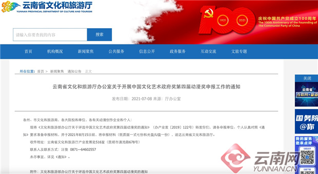 申报单位、个人可登录云南省文化和旅游厅官方网站,认真对照《通知》要求准备申报材料,并于2021年8月15日前,将申报材料(纸质版一式七份和光盘/U盘一份),送达云南省文化和旅游厅产业发展处。