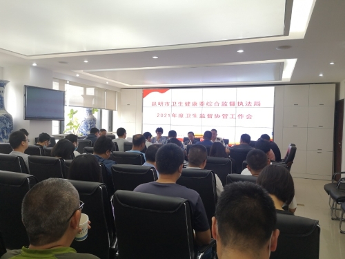为有效贯彻落实《国家基本公共卫生服务规范(第三版)》《云南省卫生健康委关于进一步加强卫生监督协管服务工作的通知》(云卫监督发〔2020〕8号)及《关于印发进一步加强昆明市卫生监督协管服务工作实施意见的通知》(昆卫法规发〔2021〕6号)文件精神,进一步提高卫生监督协管服务能力和水平,2021年6月18日,昆明市卫生健康委综合监督执法局组织召开2021年卫生监督协管工作会。全市14个县(市)区和经开区、阳宗海社会事业局卫生监督机构分管领导、协管专管监督员共计39人参加会议。