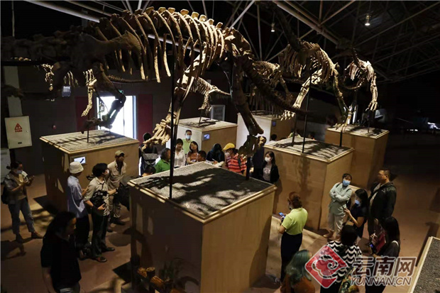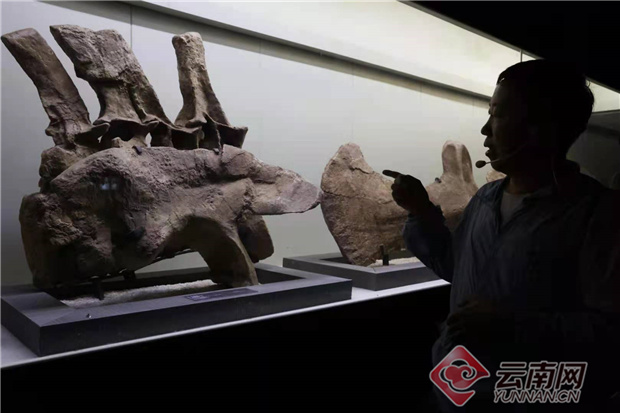 “展馆有1万平方米,设置了4个展厅和1个遗址剖面,1号展厅(精品展厅)展出40余件恐龙化石精品,2-4号展厅共展出76具装架的恐龙化石,展馆再现了禄丰恐龙的繁盛面貌。”王涛边走边说。