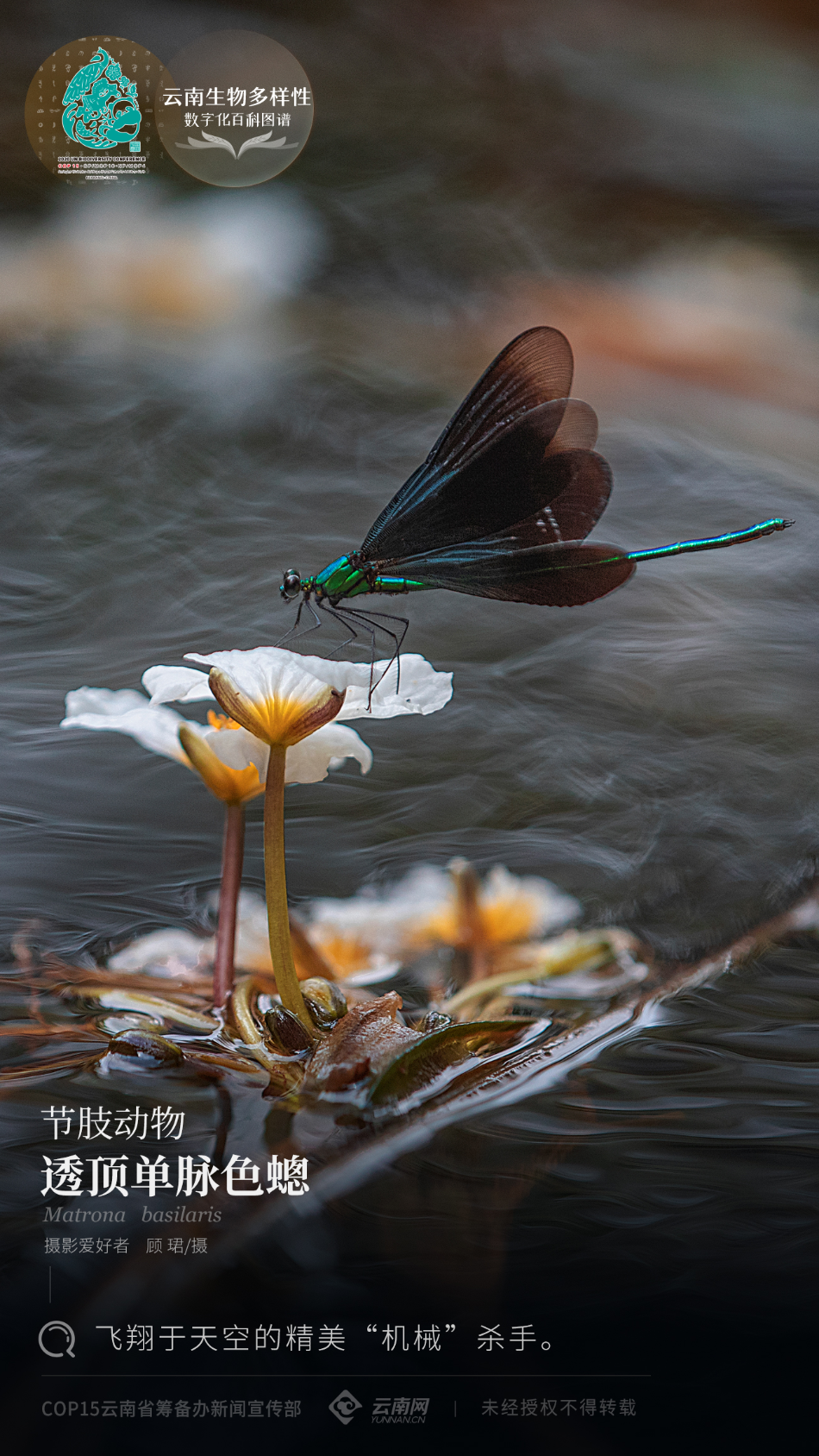 透顶单脉色蟌,隶属节肢动物,昆虫纲,蜻蜓目,色蟌科,单脉色蟌属,多栖息于水塘边植被茂密的杂草灌木丛中,国内多地分布。照片摄于昆明。