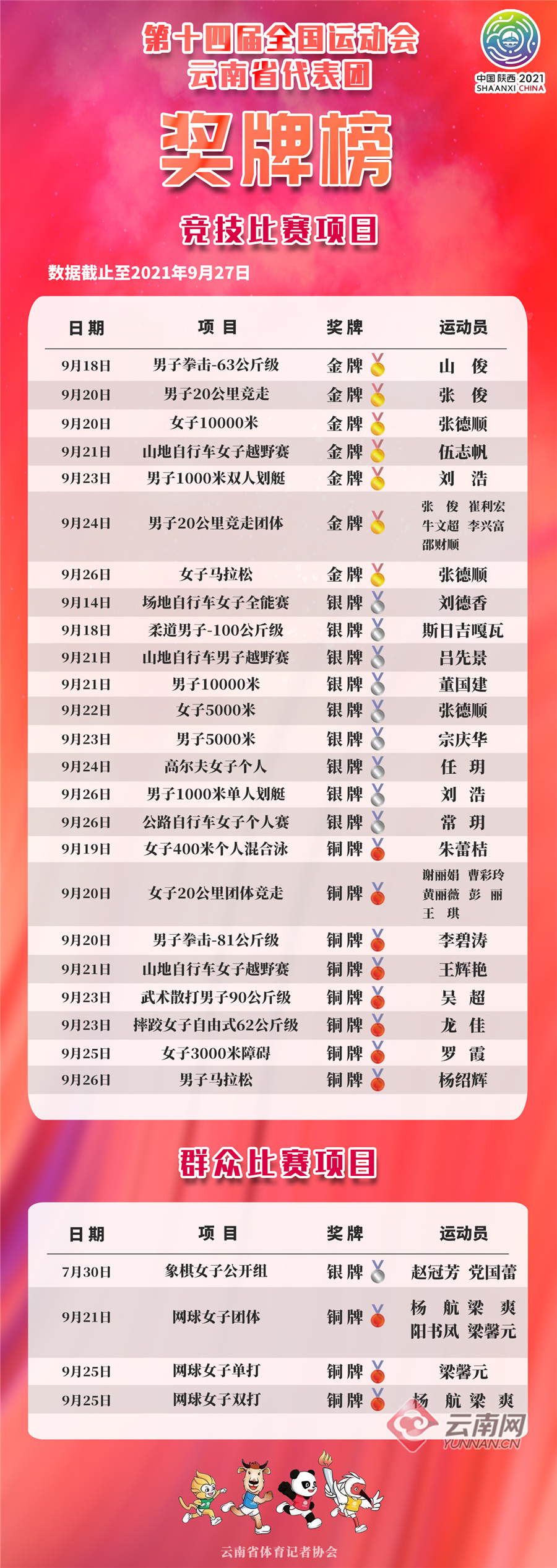 在目前已经结束的群众比赛中,赵冠芳和党国蕾获得象棋女子团体公开组亚军,网球项目除获得女子团体铜牌外,梁馨元摘得女子单打铜牌,杨航/梁爽夺得女子双打铜牌。