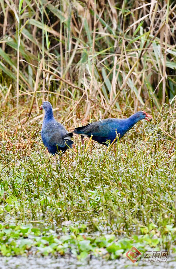 成群体的紫水鸡现身昆明。 昆明市朱雀鸟类研究所韦铭供图