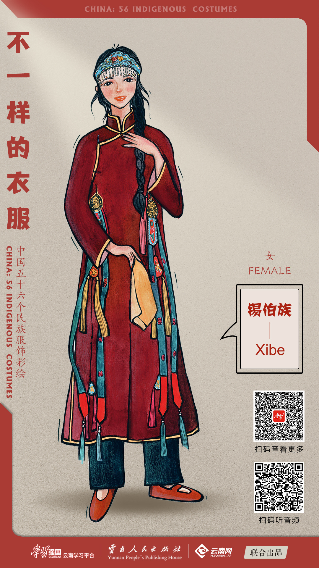 The Xibe people are an ancient nomadic people that were indigenous to the northeast region of China but some of whom were called to move to Xinjiang during the Qianlong period of the Qing dynasty. Many Xibe people now live in Qapqal Xibe autonomous county, Huocheng and Gongliu in Xinjiang; there are also some scattered settlements in Liaoning, Jilin, Heilongjiang and Inner Mongolia. Xibe costumes combine the Manchu, Mongolian and Uyghur characteristics. Men wear felt hats, long robes which are buttoned on the right, and long leather boots. Women wear qipao, tight-fitting sleeveless jackets, scarf and belts similar to those worn by the Mongol, and headbands which mix other ethnic elements. What is unique is the remarkable crown-shaped headband which is embellished with silver balls and a pearl fringe.