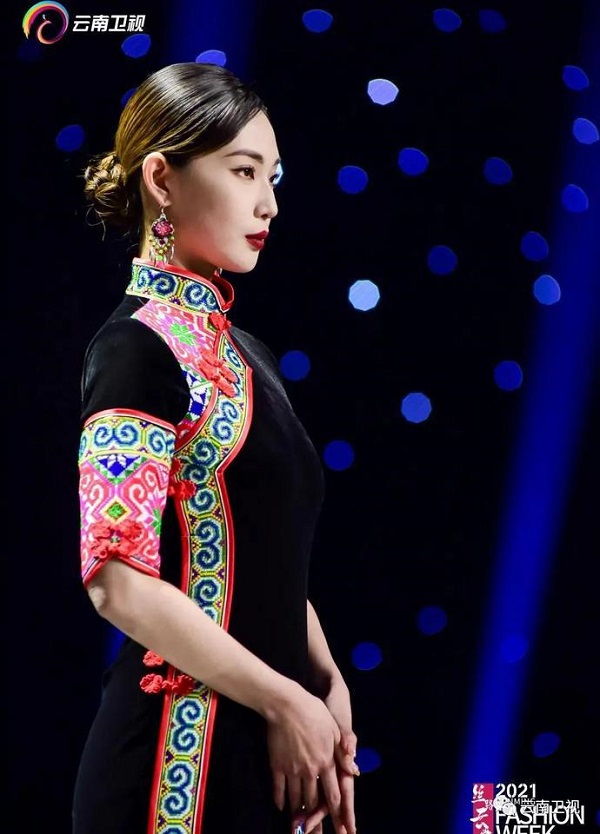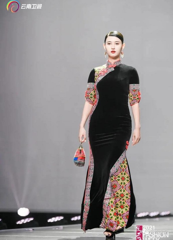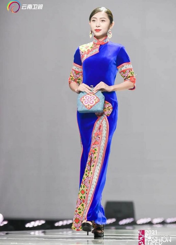 面对瞬息万变的潮流法则,越来越多的设计师将自己的目光汇聚至丰赡多彩的少数民族文化领域。来自文山壮族苗族自治州的设计师——王敏,汲取苗族服饰文化的精华,辅之以国服旗袍的形制,在丝路云裳·七彩云南2021线上昆明民族时装周的舞台上,将简洁与繁复、实用与精致、清丽与明艳完美糅合。