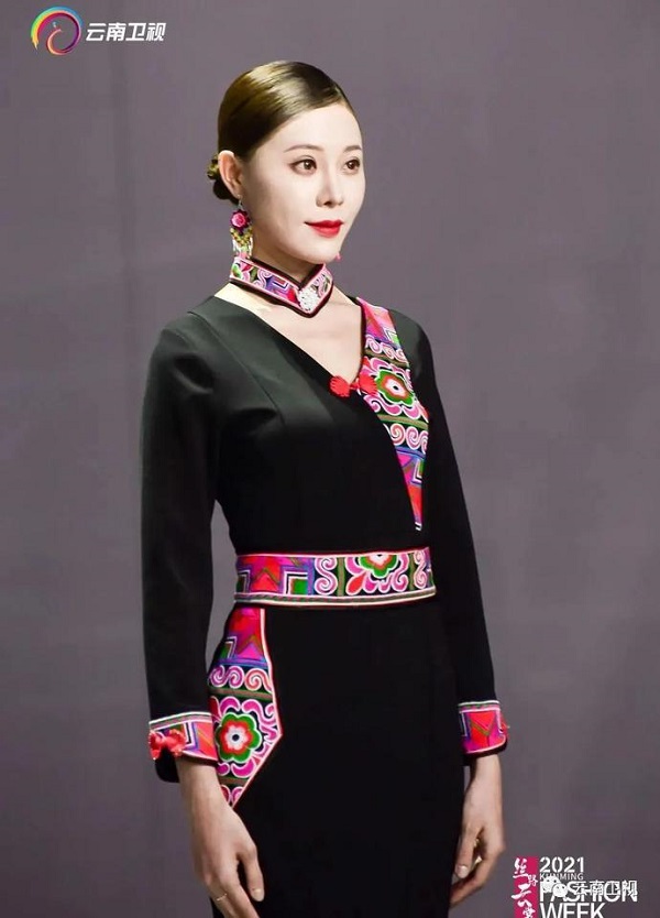 苗族传统服饰的图纹样式中,波纹刺绣与螺蛳花纹都与民族迁徙的历史紧密相关。波纹刺绣代表了曾哺育过苗族先民的黄河流域,装饰在服饰之上象征着一种对于先辈的缅怀。螺蛳花纹暗含着苗族迁徙历程中曾食用螺蛳果腹的艰辛岁月,装饰在服饰之上象征着一种对历史的回望。当间隔千年的历史与现代语境的华服相碰撞,丝路云裳·七彩云南2021线上昆明民族时装周为观众开启了一场时空交错的旅程,一场关于历史、关于记忆、关于民族的时尚盛宴。