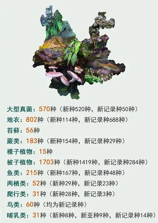 经统计,1992年至2020年云南省境内累计发现3718种新种,其中新物种2519种,新记录种1199种。