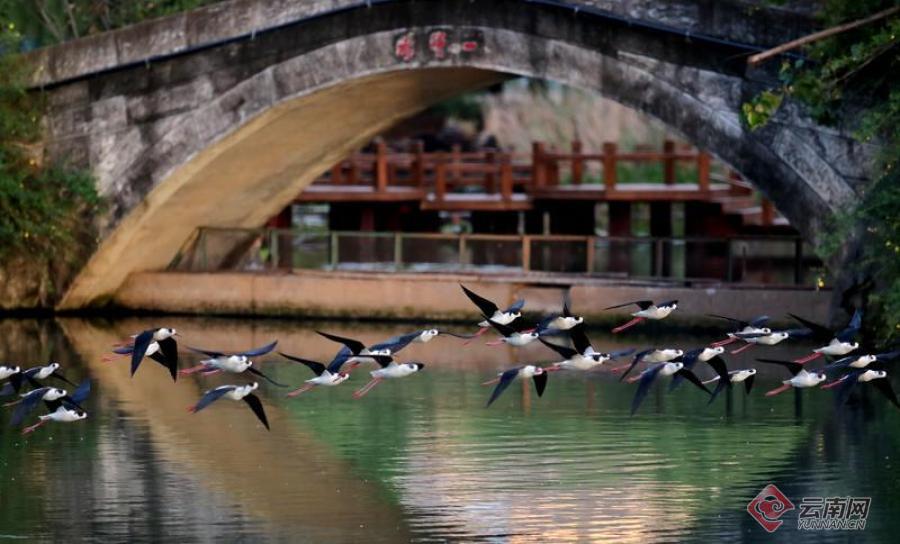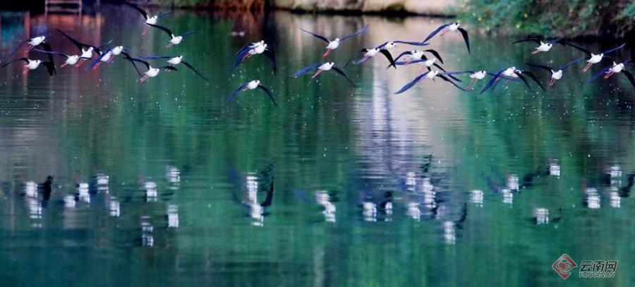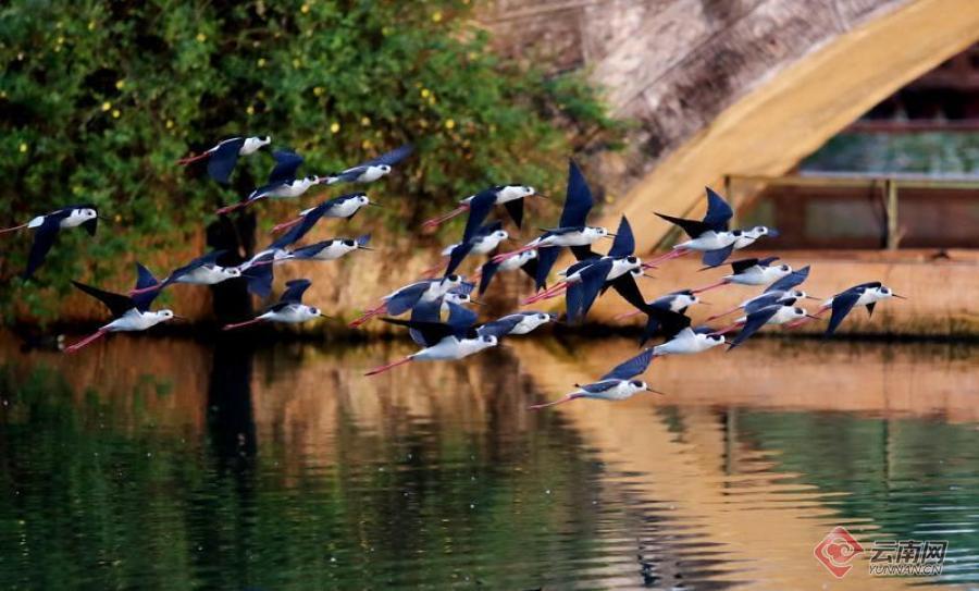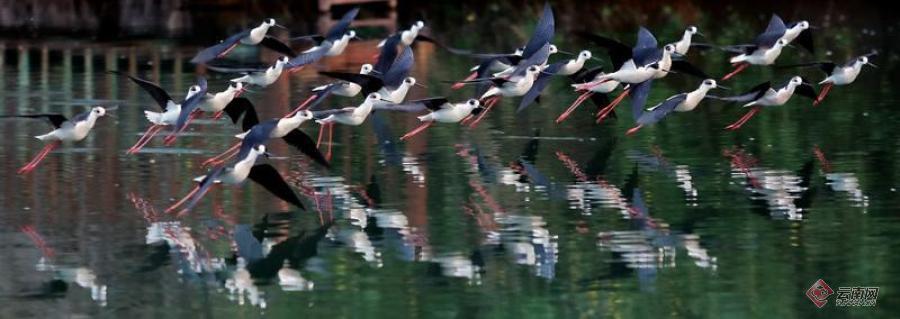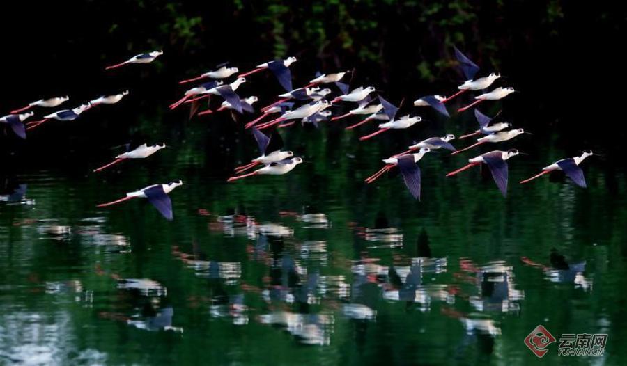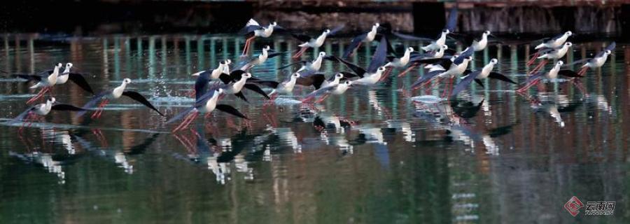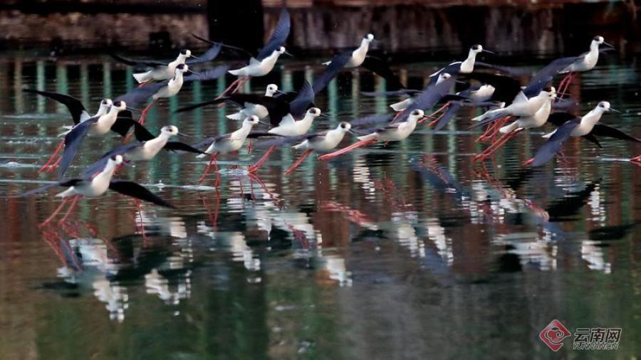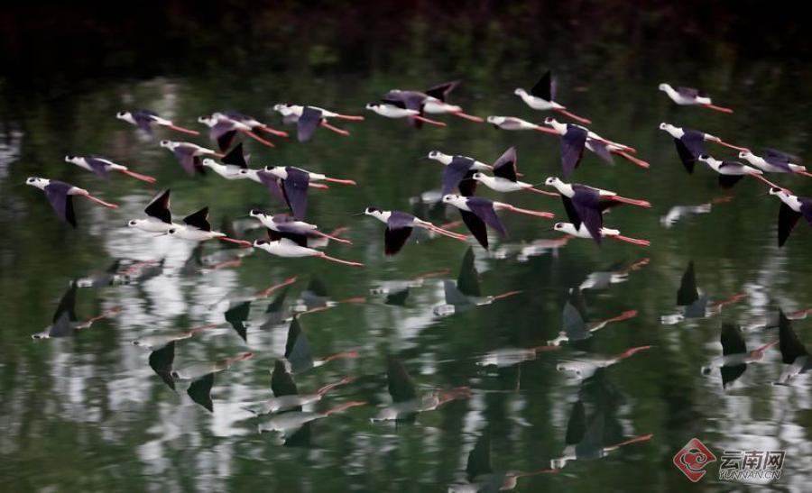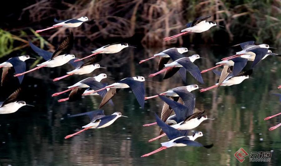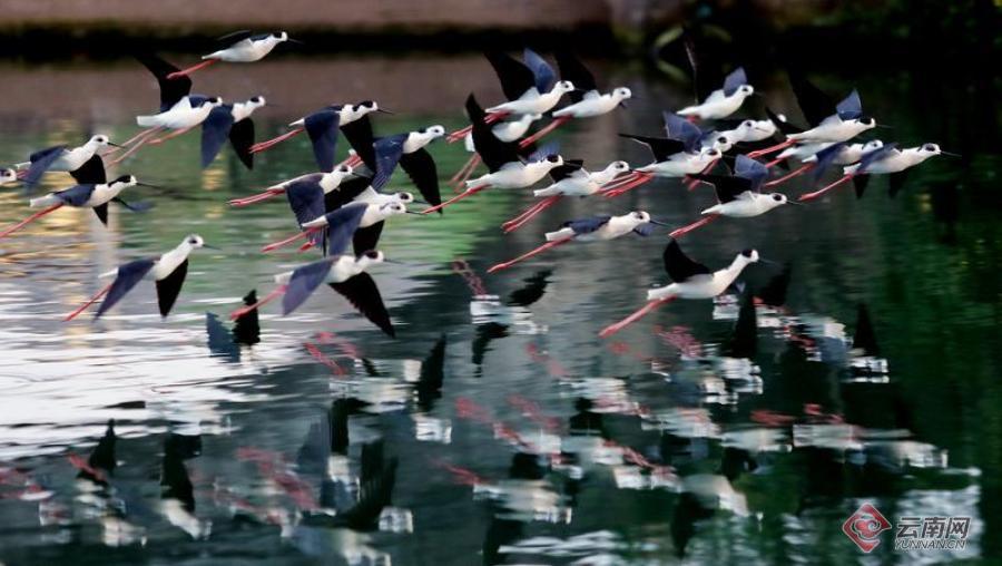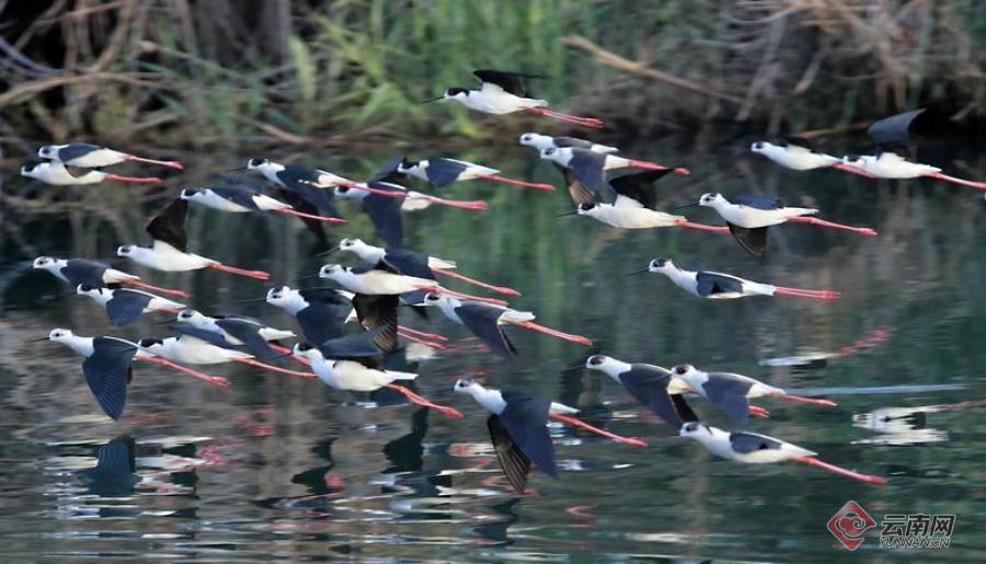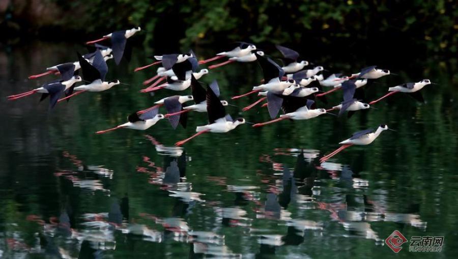 4月2日傍晚时分,在昆明大观公园外滇池草海航道水域,30余只黑翅长脚鹬集群飞翔,沿着航道水面低空贴水觅食,鸟群时而盘旋、时而俯冲,还不时发出叽叽喳喳的鸣叫;飞行的黑翅长脚鹬身姿敏捷而优雅,两只红色的长腿格外抢眼,飞翔的身影分外美丽。在滇池水域出现成群觅食的黑翅长脚鹬也非常罕见。