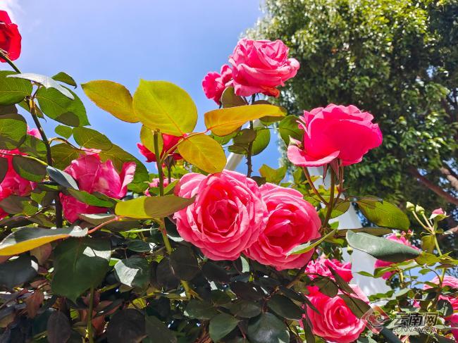 近期,昆明市呈贡区重要道路端头节点种植的1660余株树状月季、45000㎡地被月季争相绽放,一阵风吹过,大朵大朵粉色、红色的月季在枝头随风摇曳,吸引了市民驻足观赏拍照。