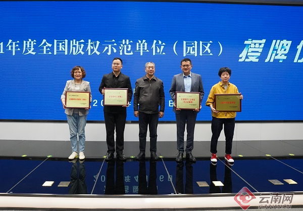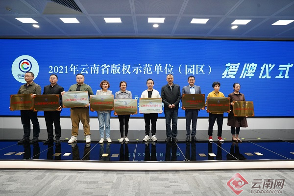 授牌仪式现场宣读命名授牌批复和通知,与会领导为荣获2021年度全国版权示范单位(园区)的4家单位、2021年度云南省版权示范单位(园区)的9家单位以及被命名为“云南省版权服务工作站”的12家单位授牌。