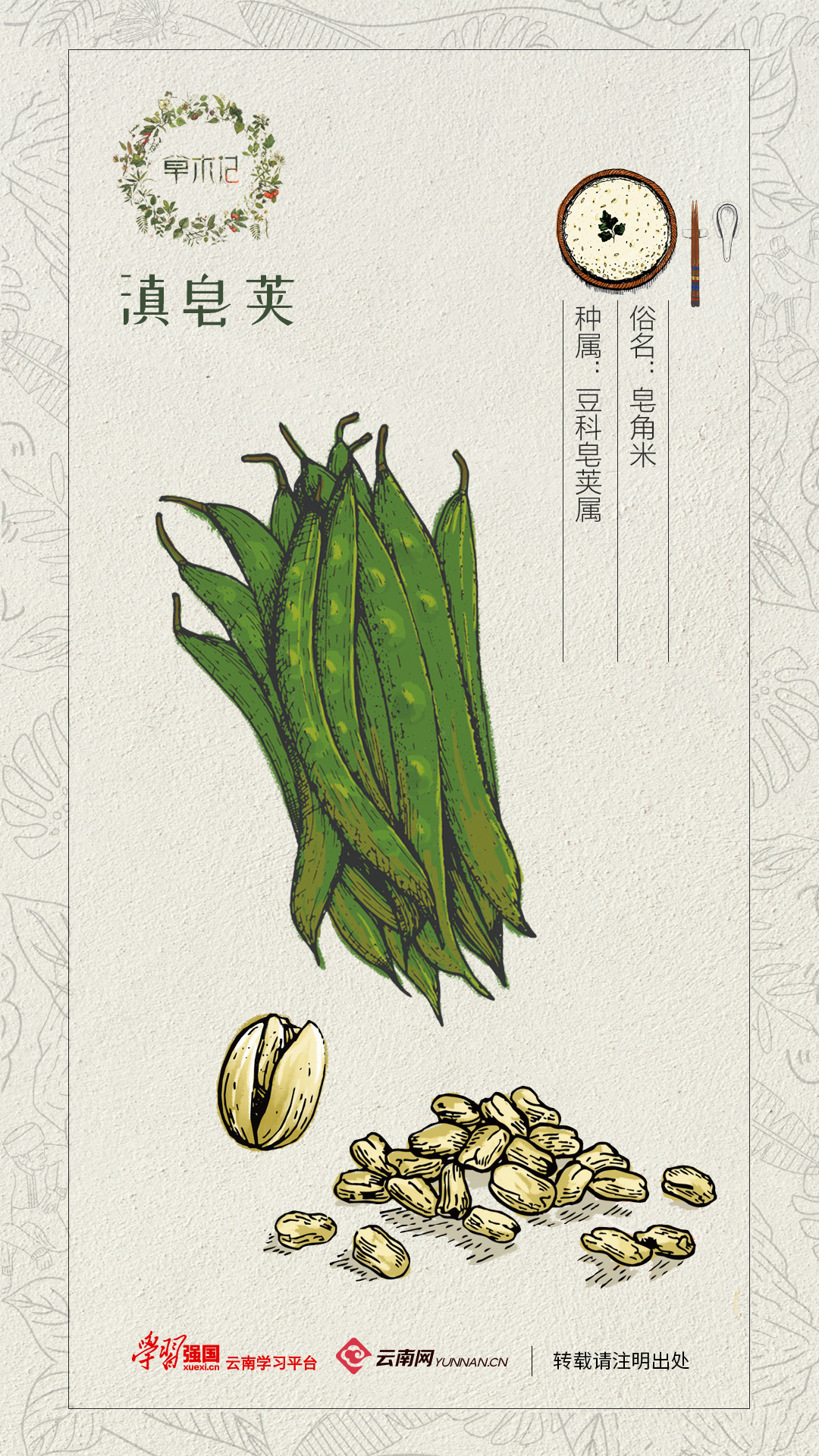 拉丁名:Gleditsia japonica var.delavayi.豆科皂荚属植物,乔木。高7米—20米,刺粗壮,有分枝,微扁平。滇皂荚荚果带状,长30厘米—50厘米,宽4.5厘米—7厘米,扁而弯,有时扭转,革质,无毛,棕黑色,网脉明显。滇皂荚主要分布于云南昆明、梁河、腾冲、嵩明、禄丰、宾川、会泽、永胜、贡山、文山、蒙自、屏边、景东等地。贵州也有分布。生长于海拔1200米—2500米的山坡疏林或路边村旁。滇皂荚木材较坚实供建筑、家具及农具用。荚果煎汁用于代皂洗涤。外胚乳含丰富多糖,胶质半透明,加热膨胀,俗称皂仁,为宴会甜食佳品。现代研究证实:滇皂角仁营养成分丰富,营养素种类较多,属高能量、高碳水化合物、低蛋白、低脂肪食物,并且能调和人体脏腑功能。还具有养心通脉,清肝明目,健脾滋肾,止咳平喘,祛痰开窍,润肠通便,润肤养颜,益精利尿,提神补气等功效。老少皆宜,特别适合糖尿病患者食用。滇皂角仁富含天然植物胶原蛋白,它可以补充皮肤各层所需的营养,使皮肤中胶原活性增强,有滋润皮肤,延缓衰老、美容、消皱、养发等功效。(文 赵玉贤)