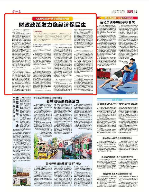 近日,云南省发布《关于贯彻落实扎实稳住经济一揽子政策措施的意见》。云南日报从12日起开设“扎实稳住经济一揽子政策措施问答”栏目,从财政政策、金融政策、扩大有效投资政策、促进消费复苏政策、保粮食能源安全政策、保产业链供应链稳定政策、优化营商环境和招商引资政策、保就业政策、保基本民生政策等9个方面,对48项政策措施进行逐一介绍,促进政策尽快发挥应有效用,推动全省经济高质量发展。