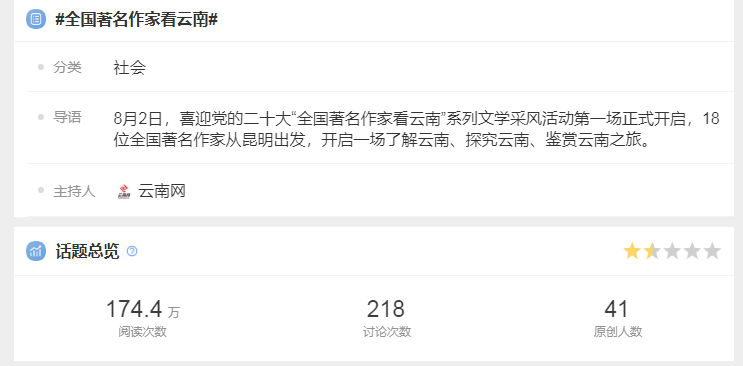 “清凉云南+文学大咖”的组合,全媒追踪的形式瞬间引爆了网络。截至2022年8月5日晚8时,云南网开设的#全国著名作家看云南#微博话题阅读量超过172万,云报客户端、开屏新闻,云南日报、春城晚报微博等全媒体平台联动,话题总阅读量达290.7万,互动次数达205次,百度相关页面超600万+。