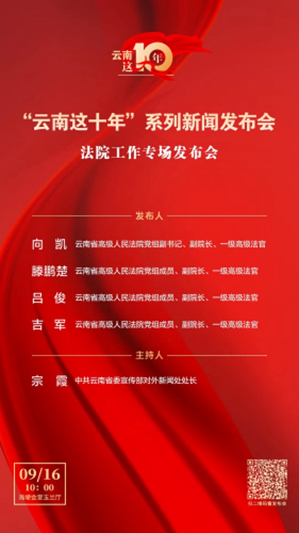 9月16日上午,“云南这十年”系列新闻发布会法院工作专场在昆明召开,省高级人民法院副院长向凯、滕鹏楚、吕俊、吉军出席发布会并回应媒体关切。此次发布紧扣“公正司法护航彩云之南高质量发展”主题,回溯2013年至今云南法院服务大局、司法为民、公正司法的工作成效。2013年至今年6月底,云南审、执结各类案件526.1万件,是上一个十年的1.26倍,其中2021年审、执结各类案件80.7万件,相比2013年增长176.02%。数据显示,云南法院这十年办案质效稳步提高,年均综合结案率、法定审限内结案率分别保持在97.29%、97.56%以上,全省法院整体工作正向全国法院第一方阵迈进。