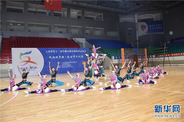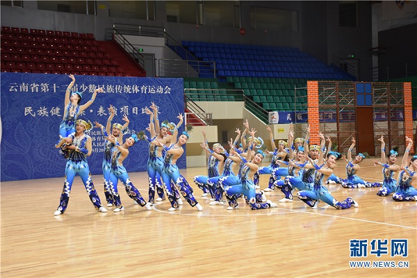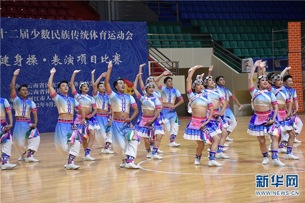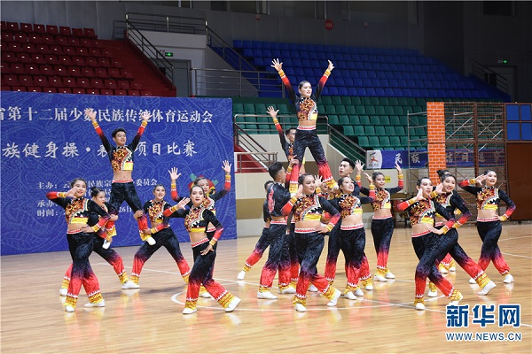 近日,云南省第十二届少数民族传统体育运动会第三阶段赛事正在开展,在民族健身操赛场上,运动员们身着具有民族特色的服装,伴随音乐整齐有力地舞动,展现着云南省不同民族的风采和风情。