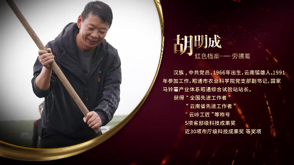 2020年,脱贫攻坚进入关键的一年。昭通市马铃薯鲜薯总产达400万吨,比2017年增加了63.8万吨,增加产值15.7亿元,主产区贫困人口人均增收1485元,马铃薯产业帮助农民实现了脱贫。这其中也包含着胡明成的一份付出,比如,他主持研发的马铃薯微型种薯设施生产技术,申报专利5项,被评价为“国际先进、国内领先”技术,在马铃薯微型种薯生产得以转化应用;他主持将马铃薯品种选育、脱毒种薯繁育及大田生产技术综合配套,在全市进行推广,有效提高了马铃薯生产科技应用水平,在2020年“洋芋帝国”建设中,鲜薯亩产达到2.52吨、创造了全国规模化马铃薯单产最高水平,最高亩产达到6015.89公斤、创造了全国马铃薯亩产最高纪录。而他也被称为“马铃薯专家”。谈及“马铃薯专家”这个称号,胡明成总是谦虚地表示:“马铃薯专家真说不上,我只是尽我的能力做好手头的事,得到了大家认可。”