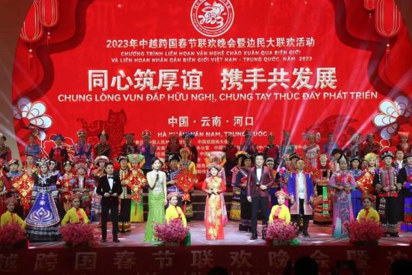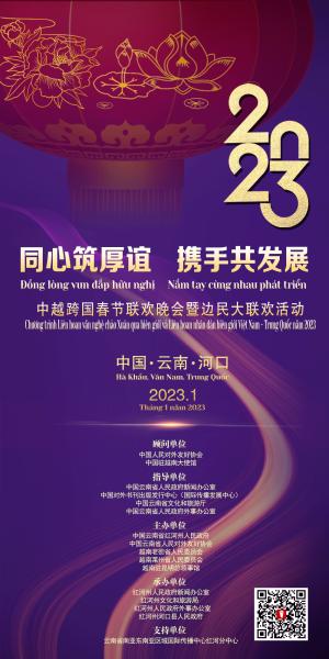 中国和越南是山水相连的好邻居、好朋友,是志同道合、命运与共的好同志、好伙伴。中越两国人民的传统节日春节即将到来之际,由中国人民对外友好协会、中国驻越南大使馆担任顾问单位,云南省人民政府新闻办公室、中国对外书刊出版发行中心(国际传播发展中心)、云南省文化和旅游厅、云南省人民政府外事办公室作为指导单位,由红河州人民政府、云南省人民对外友好协会、越南驻昆明总领事馆、越南老街省人民委员会、越南莱州省人民委员会共同主办的 2023 年中越跨国春节联欢晚会暨边民大联欢活动将于1月18日至19日分别在红河州河口县、老街省老街市举行。