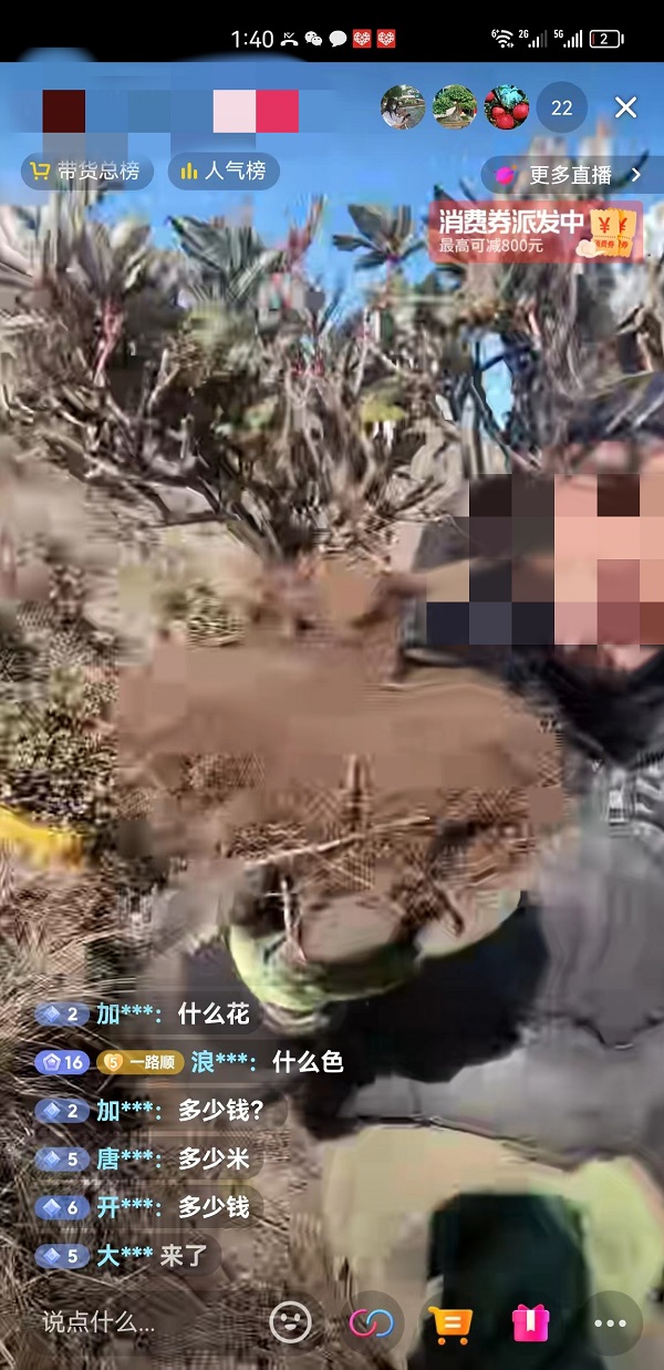 该网友在直播间留言表示,博主挖掘高山杜鹃的地方好像是在昭通,而且就在直播间现挖现卖。本来就荒芜的高海拔山区难得长出来植被,挖回去又养不活,对生态就是一种破坏。“自己在直播间做出上述留言后博主就关闭直播了,但其他挖掘野生植物的视频仍然存在。”
