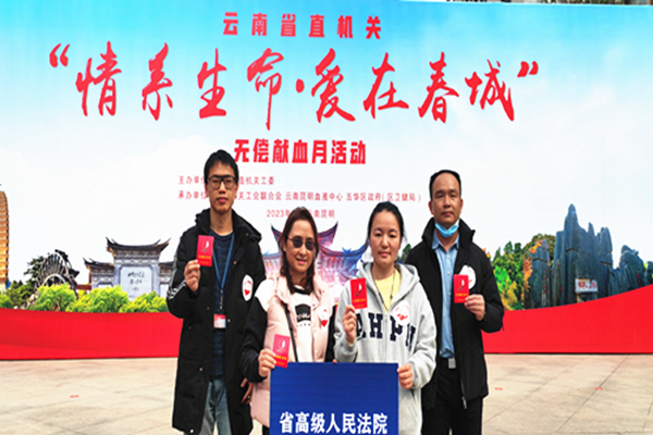 2月15日下午,由省委省直机关工委主办的省直机关无偿献血月活动集中启动仪式在昆明举行。为大力弘扬奉献、友爱、互助、进步的志愿精神,践行社会主义核心价值观,云南省高级人民法院机关党员干部职工积极参加省直机关工委组织的“情系生命 爱在春城”无偿献血月活动,以实际行动为群众办实事,弘扬司法正能量,点亮生命之光。