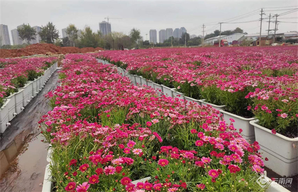 苗圃内,一盆盆花卉按照不同的类别有序地放置在公园里。据了解,苗圃正通过高水平的管理、优良植物的选择、创新的栽培模式,提升苗木质量和价值,促进苗木产业结构升级。目前苗圃已储备香樟、蓝花楹、云南樱花等各类乔木4386株、草花13.66万余盆、叶子花柱等造型灌木2148株。其中,苗圃选用了滇合欢、球花石楠、冬樱花等十余种乡土树种,乡土树种占全部储备苗木70%以上。2022年12月中旬至今年1月中旬,昆明市绿化服务中心利用苗圃公园内的花卉完成了官南立交、福德立交、石虎关立交高架挂花工作。对于高架绿化来说,除了花卉更换移栽,日常管理也是难点。由于花箱的体积较小,位置离地面较高,太阳照射强度更大、时间更长,所以高架上的绿化植物蒸腾更为旺盛,其水肥管理需要特别关注。除了供应各式各样的花卉,来自苗圃的工作人员还针对二环高架花箱配套的滴灌给水管和排水管进行巡查检修、更换,保证滴灌补水全线正常开展,避免由于缺水而造成花卉枯萎、死亡,力求用精细的管养让每一株鲜花都能在春城立交上绽放,肆意释放它的美丽。
