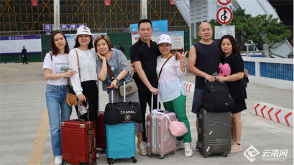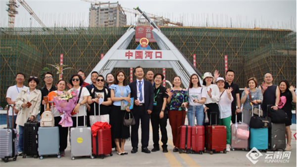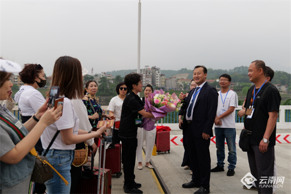 红河州及河口县文旅部门相关负责人前往河口口岸迎接,向首批来到红河的越南旅游团游客送上鲜花。据悉,从7日起,每天都将有越南旅行团队从河口入境。