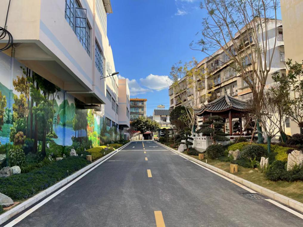 社区以“各美其美、美美与共”为主题,利用房前屋后闲置空地、墙体等传统及立体空间开展绿化美化建设,极大提升空间利用率;遵循“后院前置、后绿前移”思路,拆除所有围墙,将社区围院的通透式绿化与道路绿地充分融合,丰富城市绿化景观;保留住原生植被,充分运用乡土植物营造景观,增植云南樱花、山茶花等树种;打造特色景观小品,使社区绿化景观与当地人文历史充分结合。对人行道沿路绿化提档升级,通过彩色透水混凝土喷绘等,打造了一条优美舒适的全民健身环行跑道,形成具有本地特色的林荫绿道。