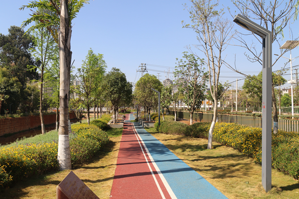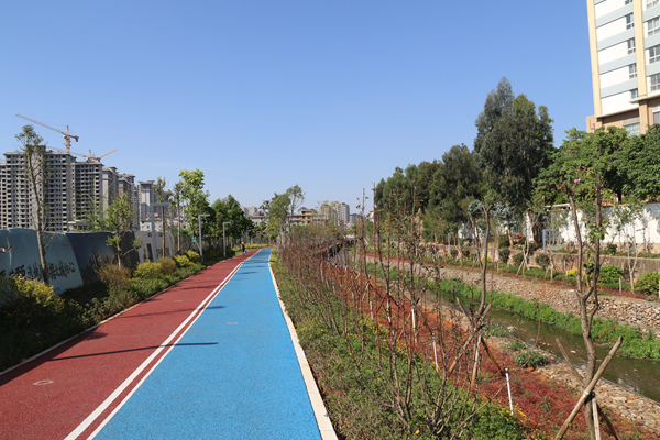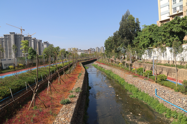 红旗河“绿美河湖”建设主要种植树木为球花石楠、滇润楠、云南松、湿地松、圆柏、四季桂、清香木、冬樱花、黄连木、三角梅桩、金竹等,共计6453株。使用乡土树种数量占比为100%,河道植物配置合理,景观良好,造景具有创意,充分彰显当地特色。同时,种植的树木均是环保树种,具有效吸烟滞尘、涵养水源、固土防沙的作用,能够有效改善库区生态环境,通过植物根系处生物膜的吸附、吸收代谢降解过程去除污水中的可溶解性有机污染物,使水体的COD浓度得以降低,所种植水杉树与周边自然植被结构一致,较好保持了原有生态。