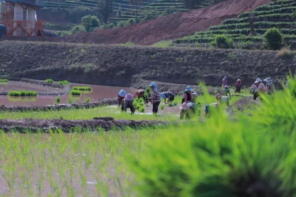 走进曼滩村民小组和席草塘村民小组的田间地头,辛勤劳作的身影随处可见,村民们身着民族服饰,顶着炎炎烈日,有的弯腰插秧、有的驾驶机械在田间来回穿梭,呈现出一派繁忙的景象。在大伙的共同努力下,一株株翠绿的秧苗被均匀地插入水田中,翠绿秧苗随风摇曳,与躬身忙碌的村民共同勾勒出一幅如诗如画的耕作图景。