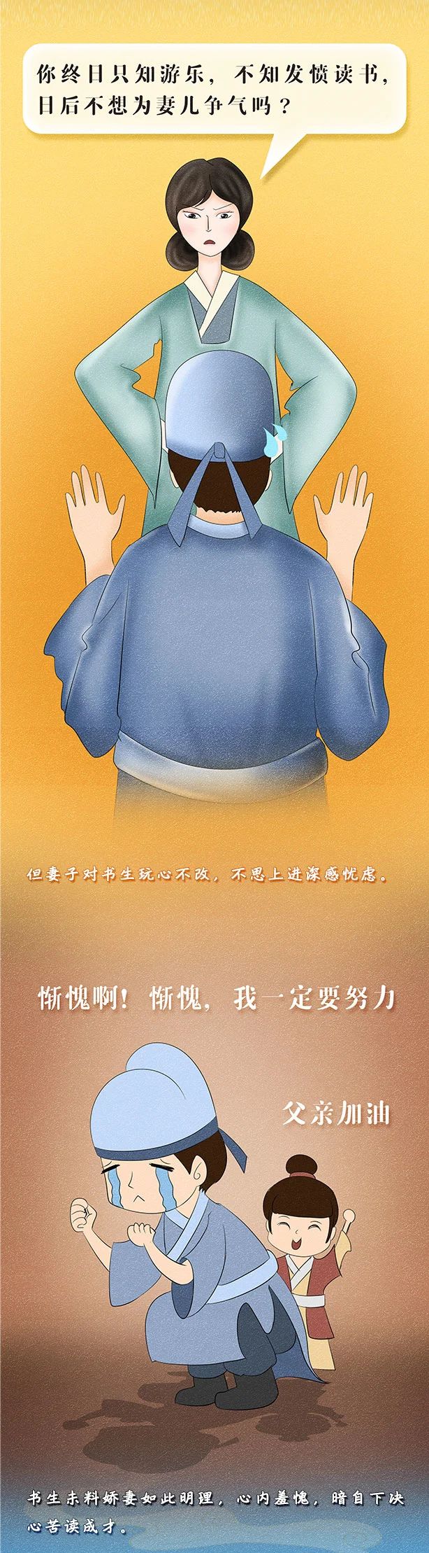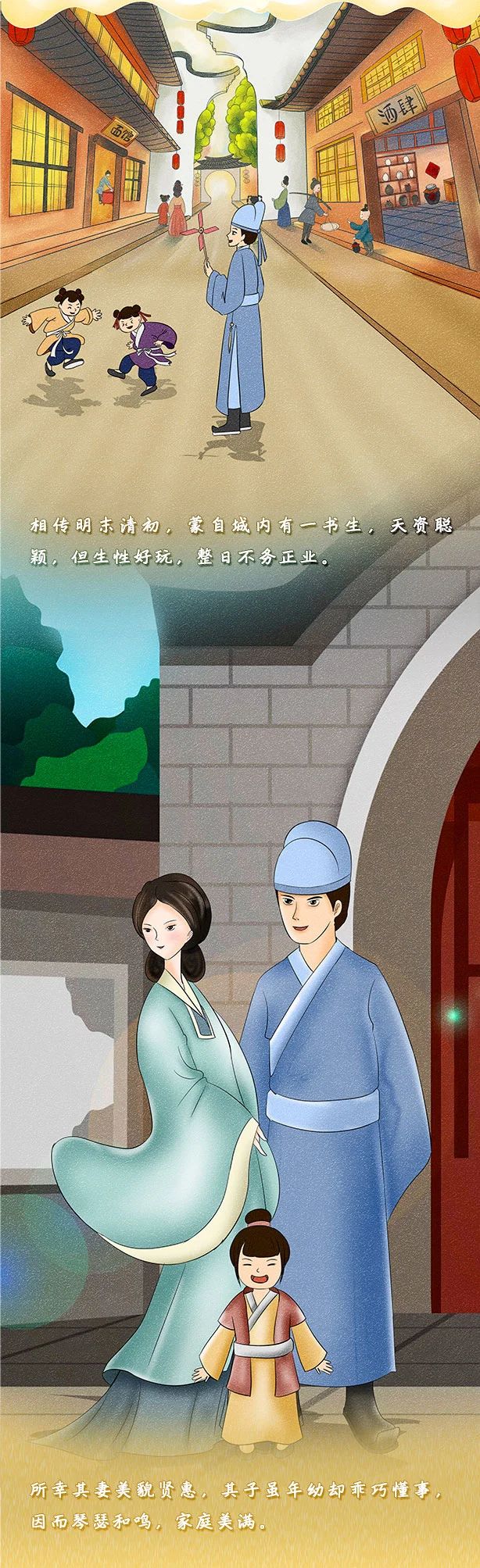 但妻子对书生玩心不改、不思上进深感忧虑,一日劝告书生:“你终日只知游乐,不知发愤读书,日后不想为妻儿争气吗?”书生未料娇妻如此明理,内心羞愧,暗自下决心苦读成才。