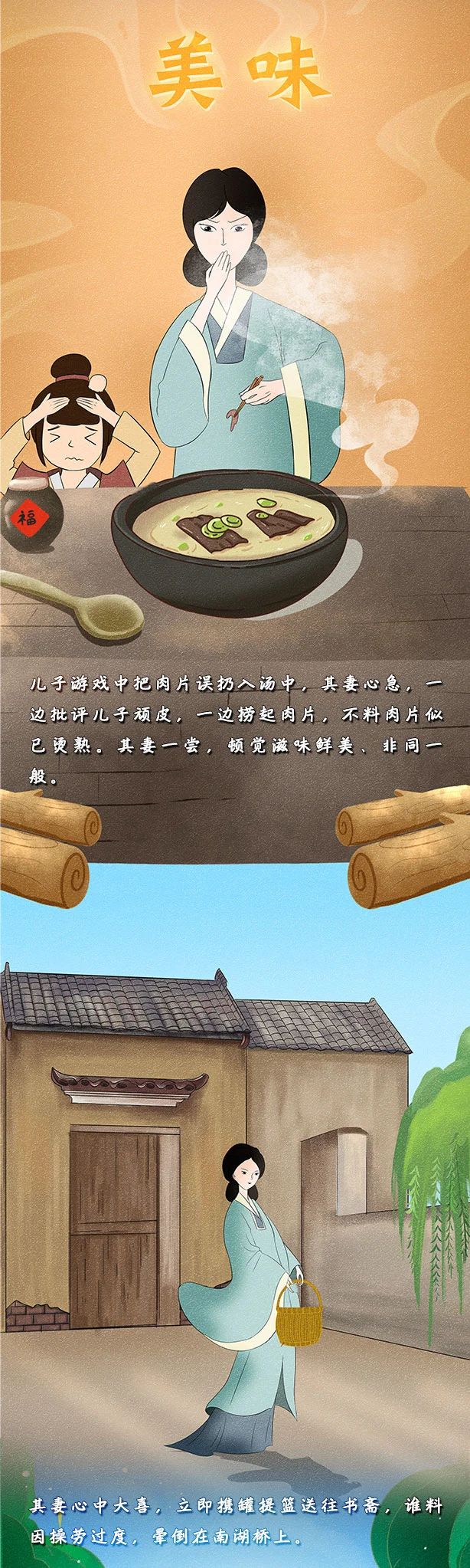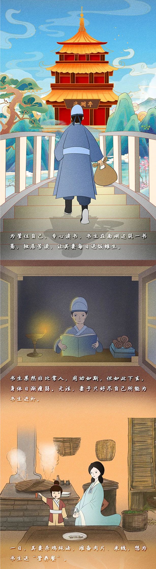 为管住自己,专心读书,书生在南湖边筑一书斋,独居苦读,让其妻每日送饭维生。其妻又喜又忧,喜的是书生果然非比寻常,用功如斯;忧的是如此下去,身体日渐瘦弱。无法,只好尽自己所能为书生进补。