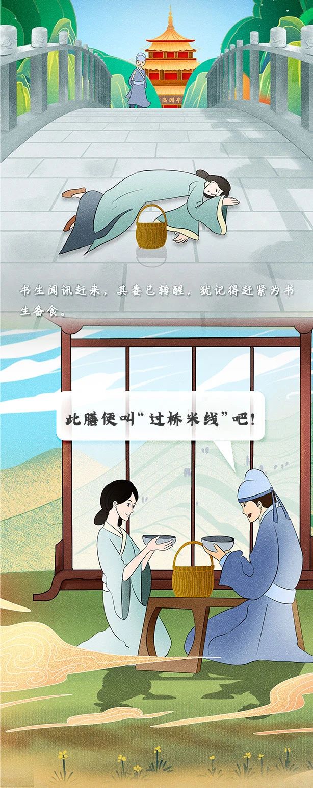 一日,其妻杀鸡炖汤,准备肉片、米线,想为书生送“营养餐”。儿子在游戏时把肉片误扔入汤中,其妻心急,一边批评儿子顽皮,一边捞起肉片,不料肉片似已烫熟。其妻一尝,顿觉滋味鲜美、非同一般,心中大喜,立即携罐提篮送往书斋,谁料因操劳过度,晕倒在南湖桥上。