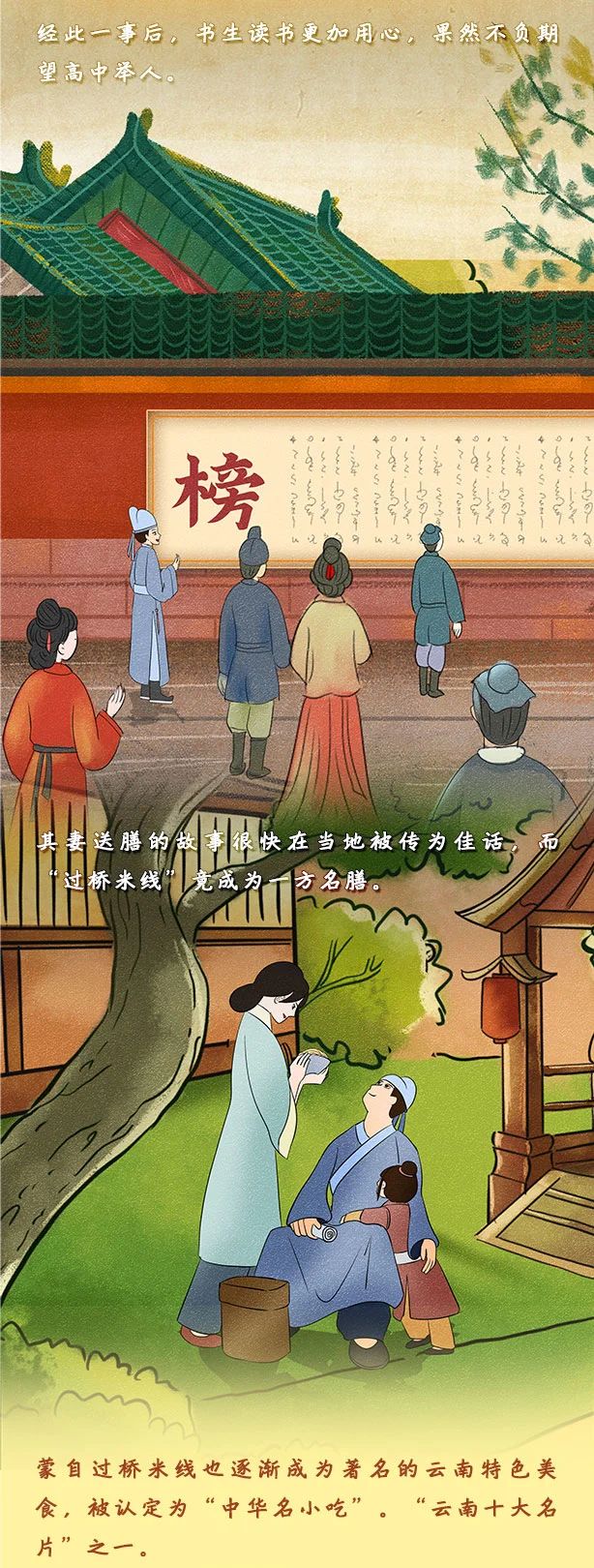 经此一事后,书生读书更加用心,果然不负期望高中举人。其妻送膳的故事很快在当地被传为佳话,而“过桥米线”竟成为一方名膳。