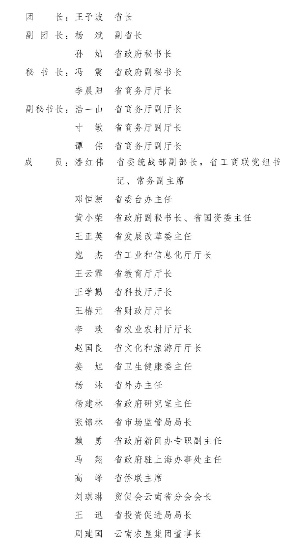 省委台办负责我省台商的邀请报名参会工作,组织我省采购商与参展台资企业对接洽谈;省工业和信息化厅负责组织全省有技术合作需求的企业参会;省财政厅负责保障省交易团工作专项经费的预算、审批和监督管理;省国资委负责组织省属企业参会,挖掘采购需求,扩大采购成果;省市场监管局负责做好参会企业资质审查工作,确保企业信息真实、企业信用可靠;省教育厅、省科技厅、省农业农村厅、省文化和旅游厅、省工商联、省侨联等成员单位负责行业内企业(单位)的组织邀请及采购促进工作;省政府研究室负责省领导出席有关活动文稿的牵头起草工作;云南农垦集团负责配合做好主题活动的筹备工作。
