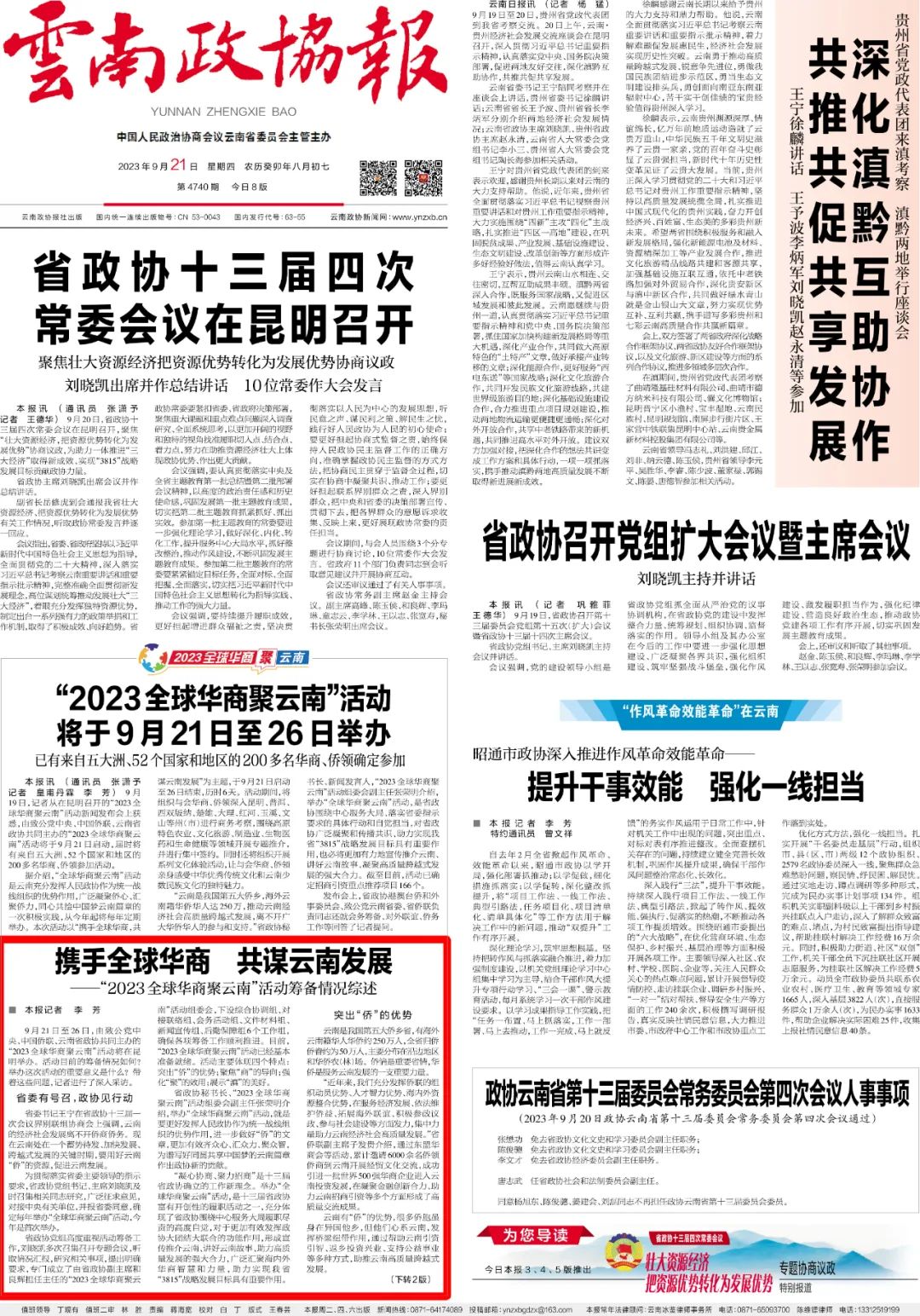 “凝心协商、聚力招商”是十三届省政协确立的工作新理念。举办“全球华商聚云南”活动,是十三届省政协富有开创性的履职活动之一,充分体现了省政协围绕中心服务大局履职尽责的高度自觉,对于更加有效发挥政协大团结大联合的功能作用,形成宣传推介云南、讲好云南故事、助力高质量发展的强大合力,广泛汇聚海内外华商智慧和力量,助力实现我省“3815”战略发展目标具有重要作用。