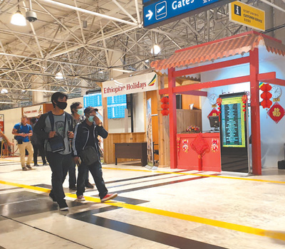 旅客经过埃塞俄比亚博莱国际机场内的中文服务台。记者 万宇 摄