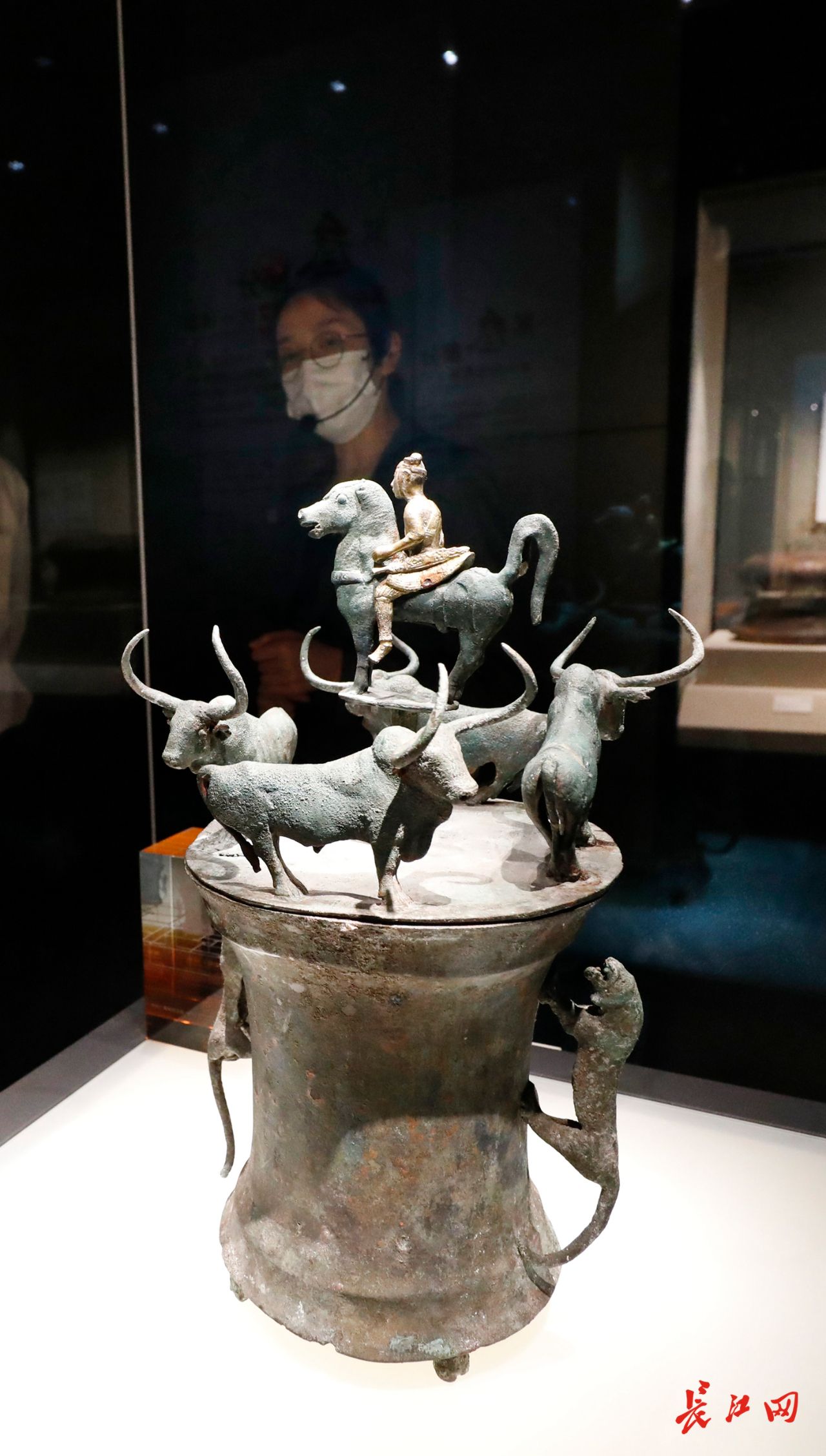 造型奇特、纹饰精美的古滇国贮贝器。器盖上规模宏大的立体雕塑代表着云南青铜器失蜡法铸造的最高成就。探访调研团成员王筝 摄