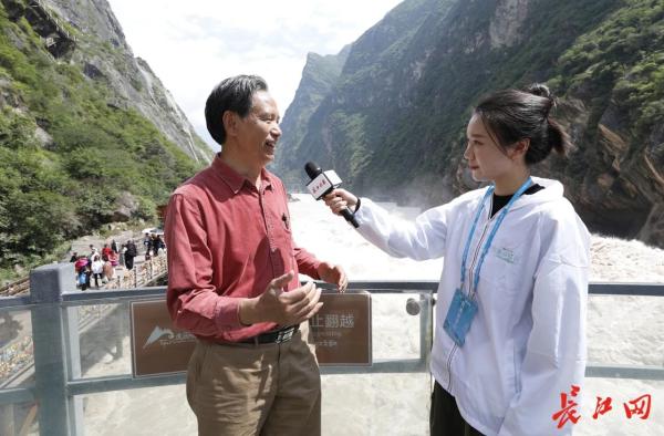 “沿着长江读懂中国——万里长江行”主题宣传推广活动探访调研团走进云南虎跳峡。图为长江网记者采访探访调研团特邀专家、湖北大学历史文化学院特聘教授郑晓云。探访调研团成员王筝 摄