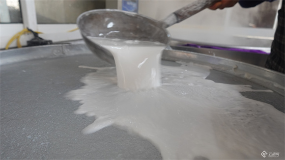 一粒粒米随着石磨的转动变成了白色的米浆,散发出淡淡的米香。把米浆与水搅拌在一起后,舀一勺放入一个圆盘中,转动圆盘,米浆迅速流向圆盘的各个角落。当整个圆盘被米浆铺满后,盖上锅盖蒸两分钟左右,米浆就凝固了。待其冷却后取出,一张晶莹剔透的手工卷粉就制作完成了。