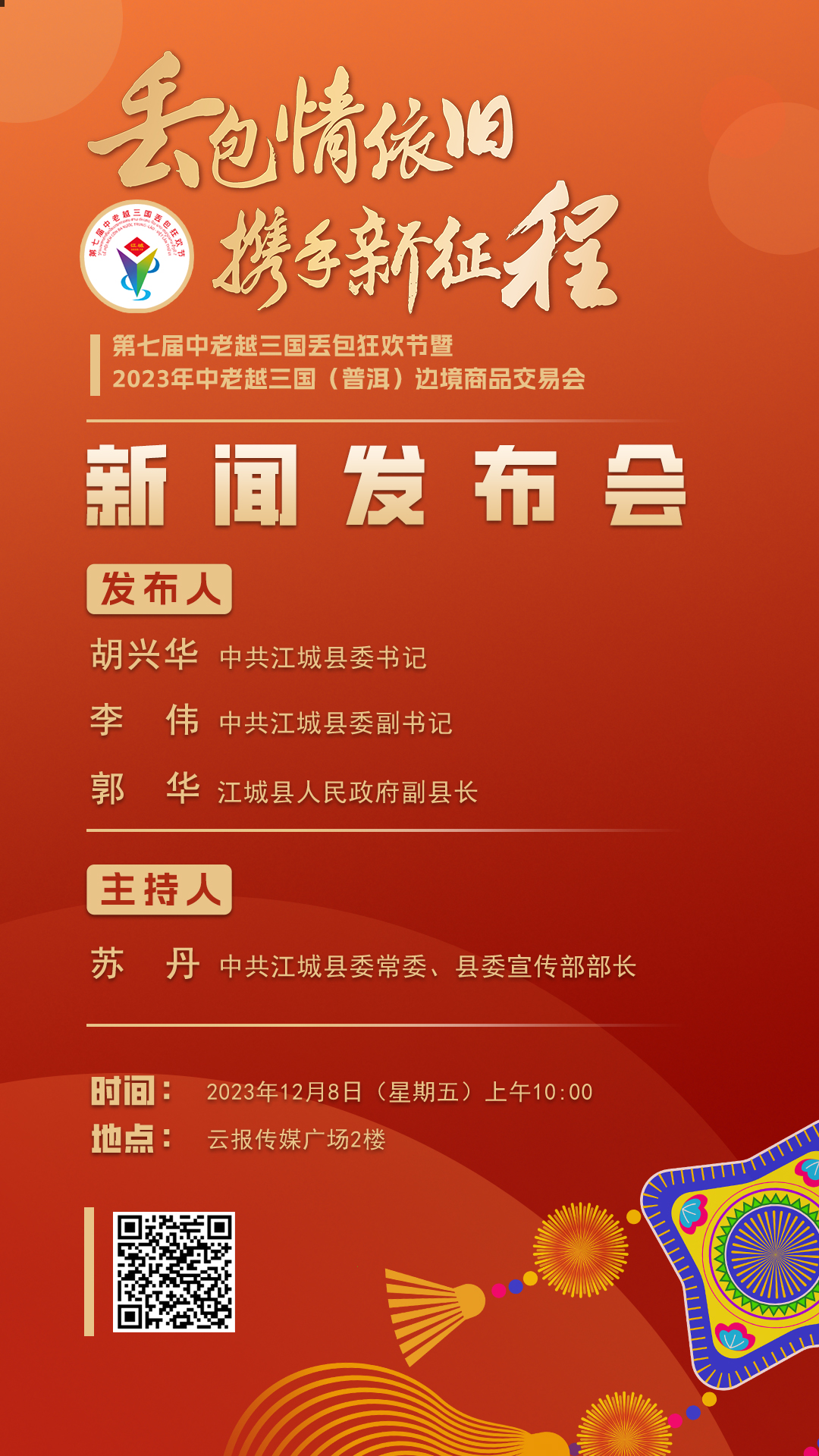 12月8日上午10点,第七届中老越三国丢包狂欢节暨2023年中老越三国(普洱)边境商品交易会新闻发布会将在昆明召开。此次发布会将介绍丢包节暨边交会有关情况并回答记者提问。敬请期待!