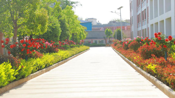 学校总面积为34906.67平方米,其中绿化面积为10640平方米,绿化覆盖率为30.48%。学校按照四季常绿、三季有花、校在林中、鸟语花香理念,着力打造集公园、林园、花园、乐园为一体的绿美校园。规划设计上,坚持以绿色自然为特色,乔木、灌木与草皮合理分布,乔木有日本晚樱、香樟、广玉兰、桂花等,遍布广场、走道旁、围墙边;灌木有金森女贞、红叶石楠、亮晶女贞、小叶黄杨、树状月季、西洋杜鹃等近20个品种,栽植于高大乔木之下,显得错落有致。枝繁叶茂的常绿乔木灌木,形成了学校良好的生态环境和鸟类栖息之地,给人们带来愉快的心情和美的享受。